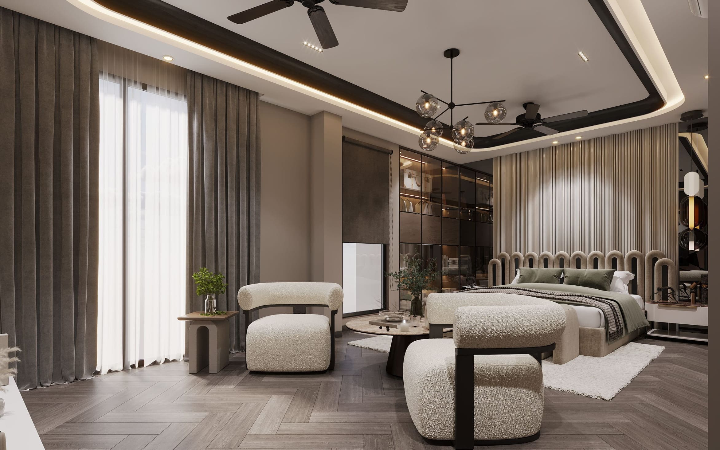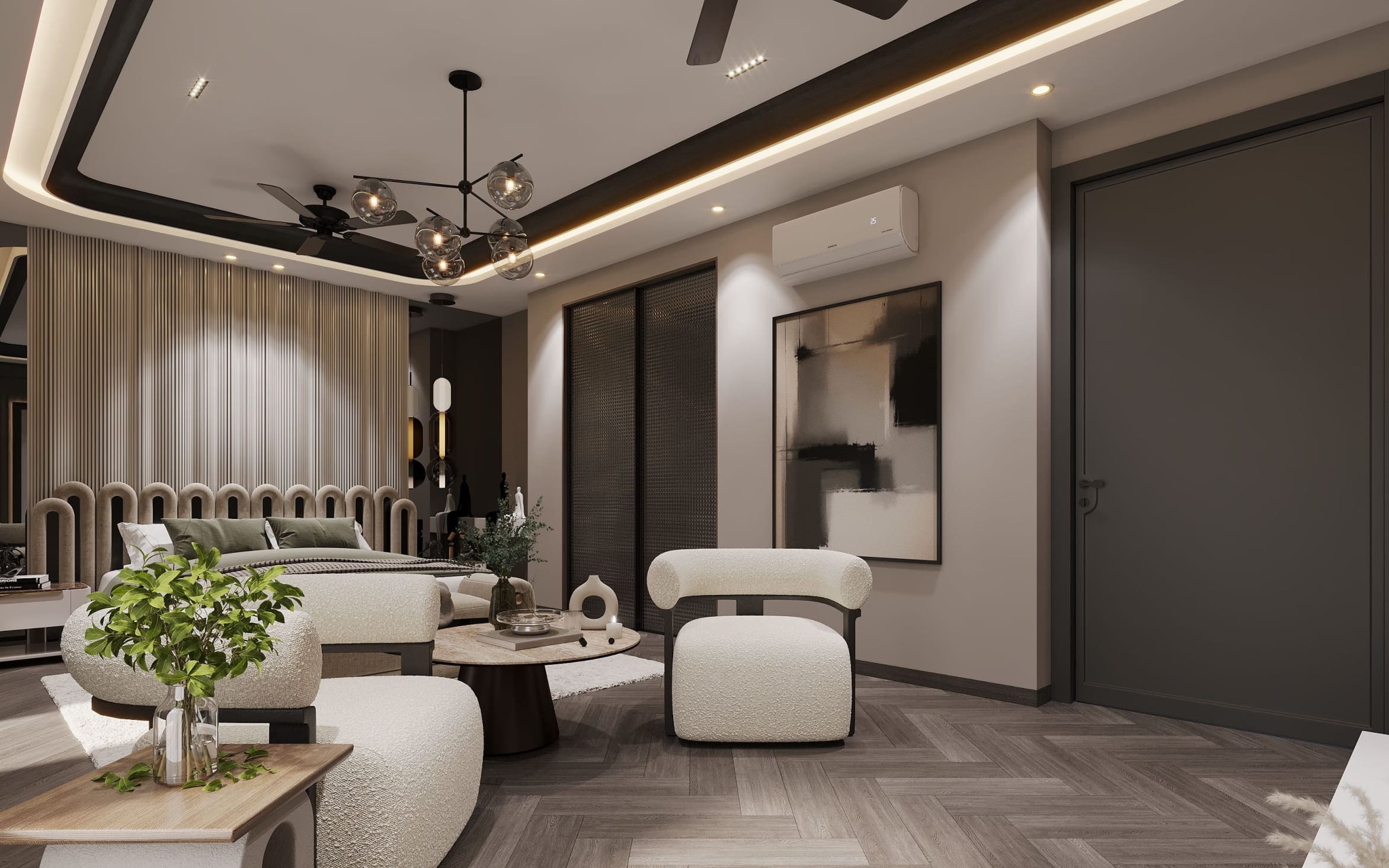 This bedroom features a beautifully designed modern space with rich wooden flooring that brings warmth and elegance to the room. The ceiling, adorned with stylish lights, enhances the atmosphere, creating a soft and inviting glow that perfectly complements the contemporary design. The wallpapered walls add texture and visual interest, enriching the overall aesthetic. With a focus on simplicity and luxury, this room is both a serene retreat and a functional space, ideal for relaxation and comfort.