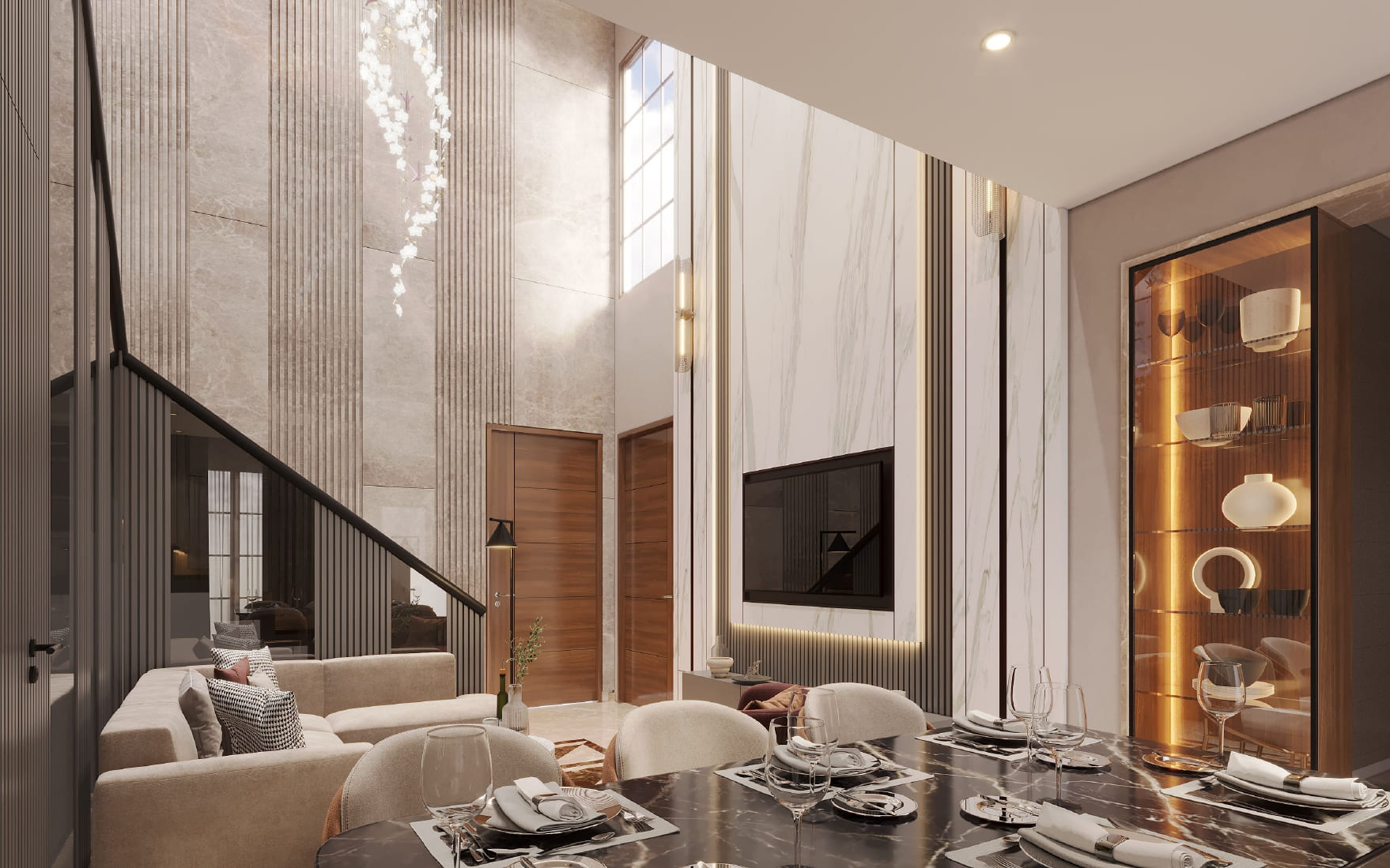 This breathtaking double-height living space redefines luxury with its towering marble-clad feature wall, refined vertical accents, and cascading floral chandelier that draws the eye upward in pure admiration. Warm wooden elements and plush furnishings blend comfort with elegance, while ambient lighting and thoughtful decor infuse sophistication into every corner. A perfect balance of volume and intimacy, this interior is a timeless statement of contemporary design excellence.