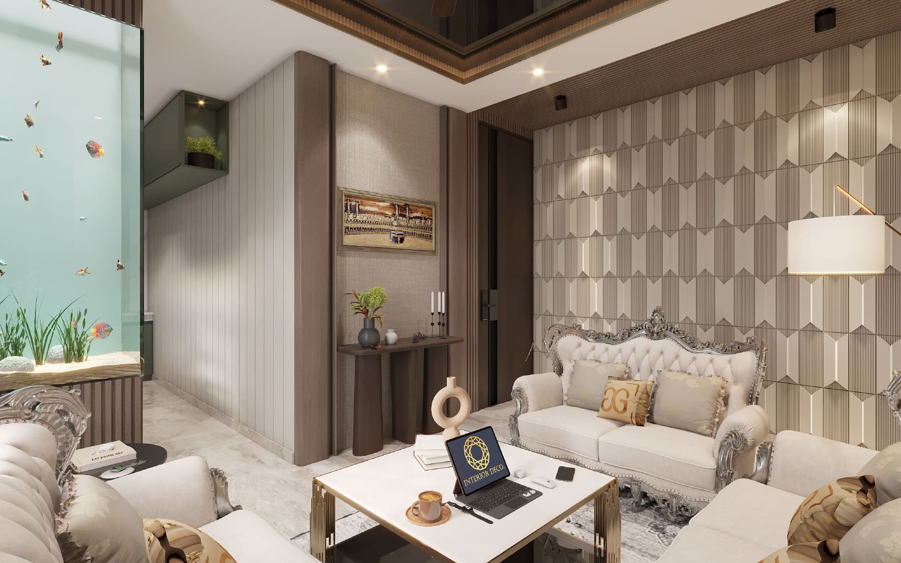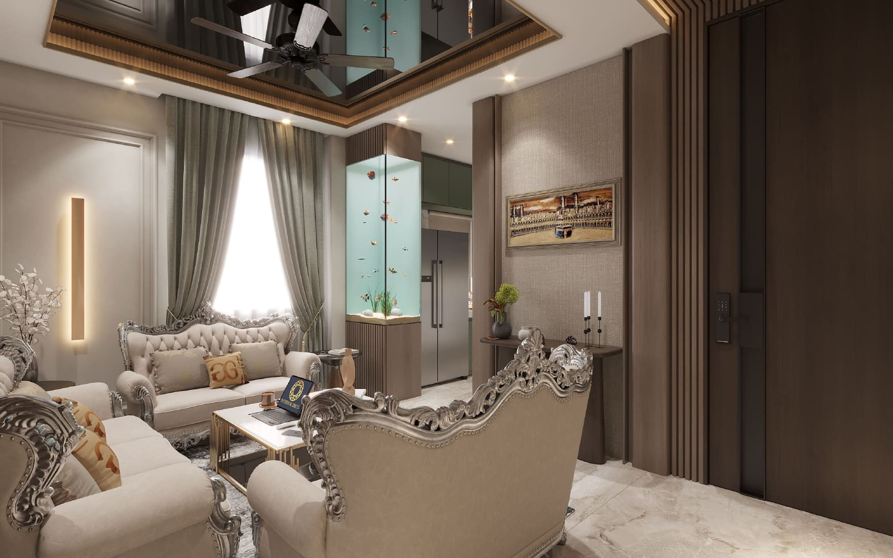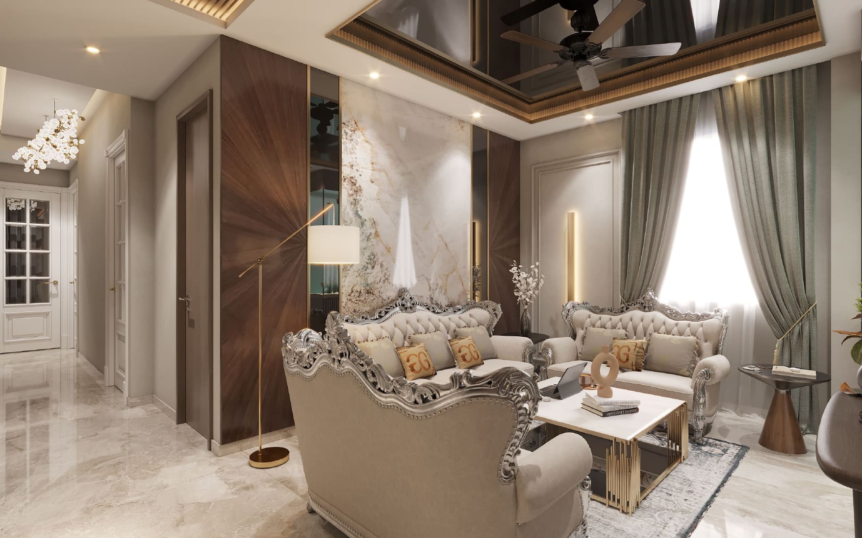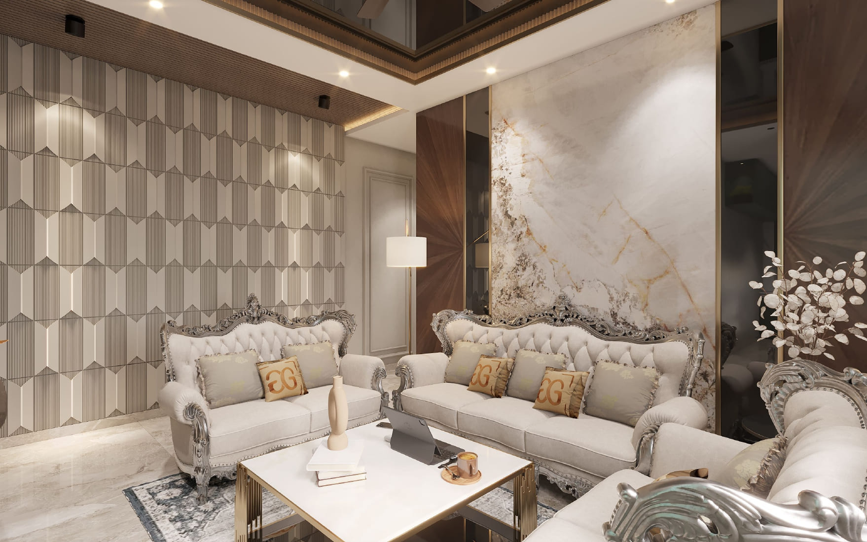 This lavishly designed living room brings regal elegance to life with its intricately carved Victorian-style furniture, plush upholstery, and a rich palette of creams and golds. The marble accent wall radiates grandeur, beautifully balanced by the geometric patterns on the opposite side. Gold metallic elements and soft ambient lighting add a contemporary twist, creating a space that feels both timeless and refined. It’s a true celebration of luxury living with a royal touch.