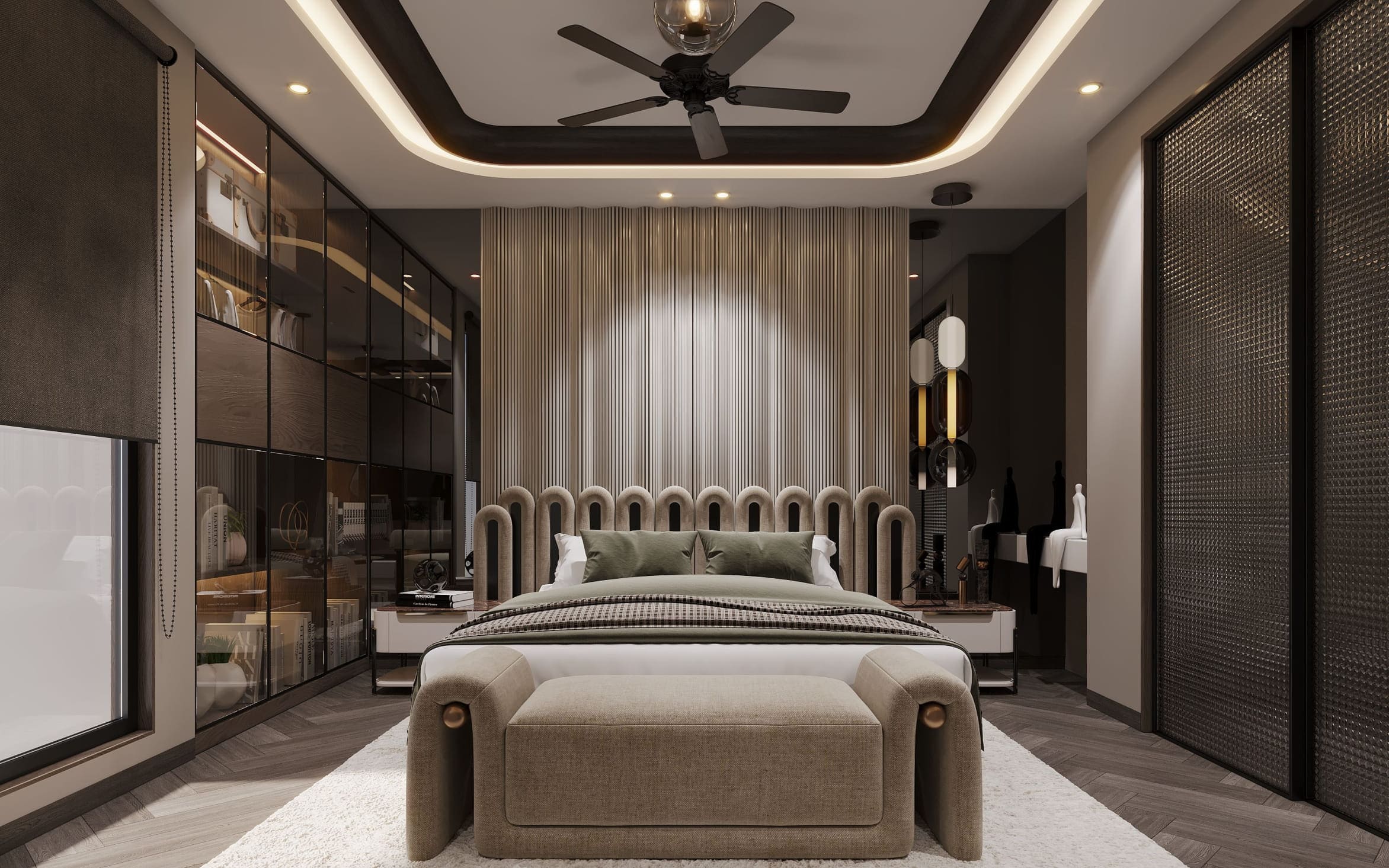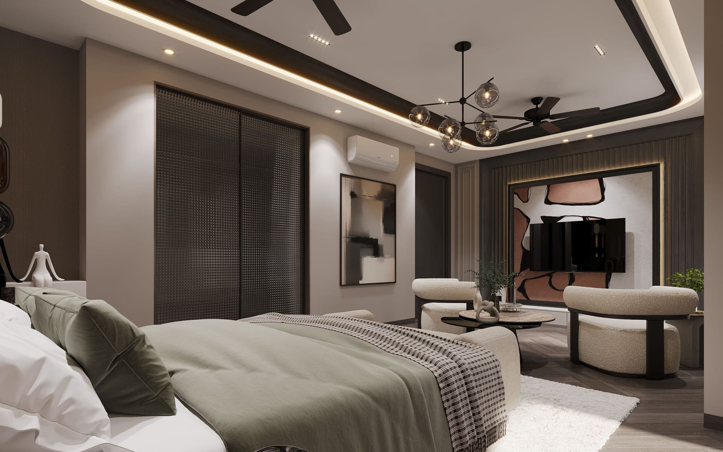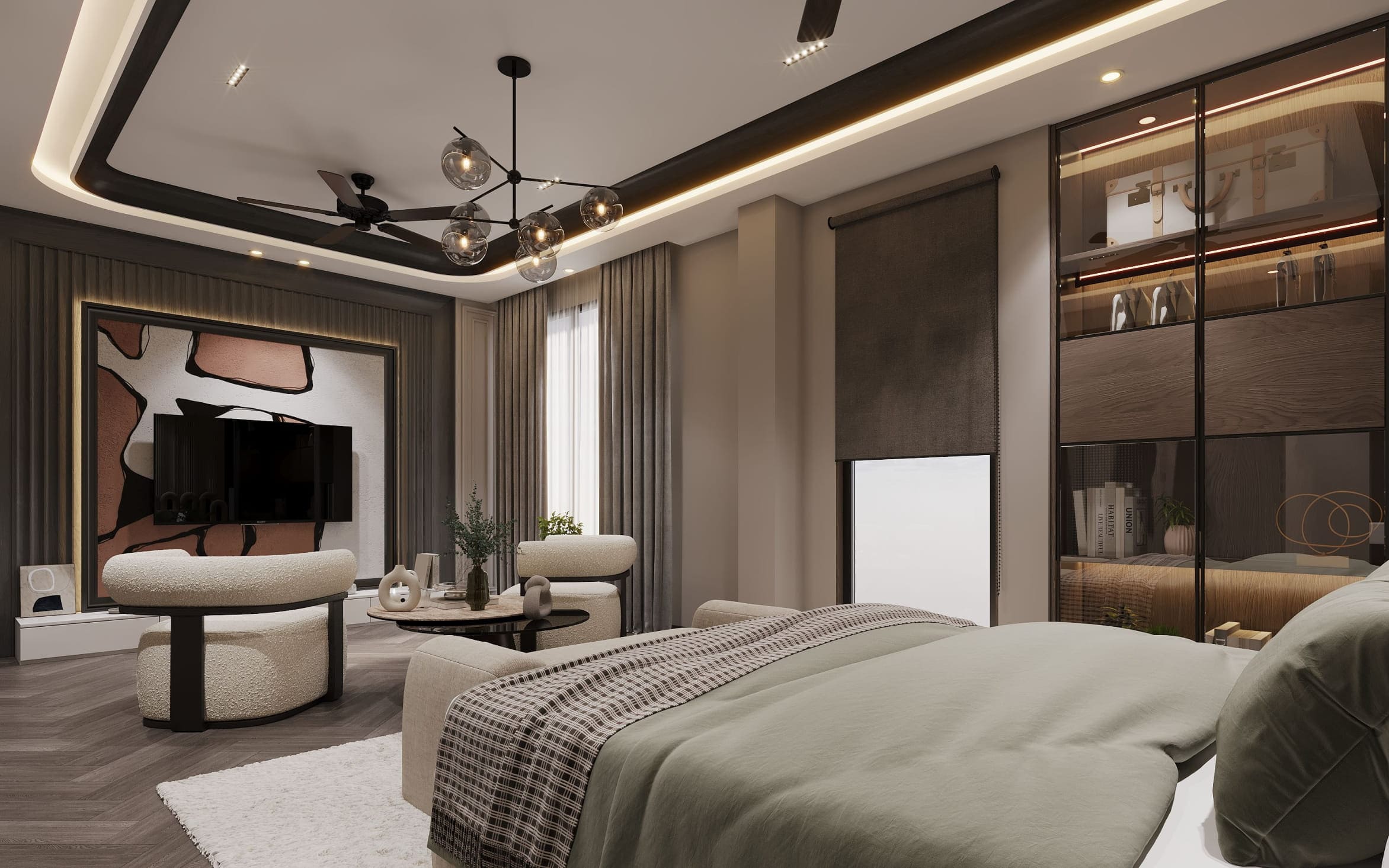 This bedroom features a beautifully designed modern space with rich wooden flooring that brings warmth and elegance to the room. The ceiling, adorned with stylish lights, enhances the atmosphere, creating a soft and inviting glow that perfectly complements the contemporary design. The wallpapered walls add texture and visual interest, enriching the overall aesthetic. With a focus on simplicity and luxury, this room is both a serene retreat and a functional space, ideal for relaxation and comfort.