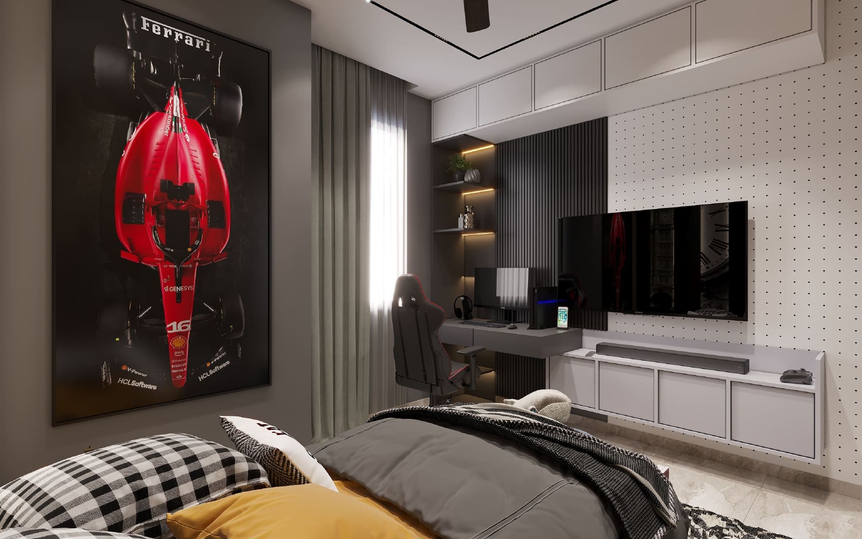 This striking bedroom perfectly balances sophistication with youthful energy, creating a space that's both mature and playful. The room showcases a carefully curated aesthetic that speaks to the modern teenager's desire for both style and functionality. The room's foundation rests on a sophisticated gray and black color scheme, punctuated by vibrant red accents that add personality and energy. The deep charcoal curtains create dramatic vertical lines while filtering natural light to maintain the room's moody ambiance.