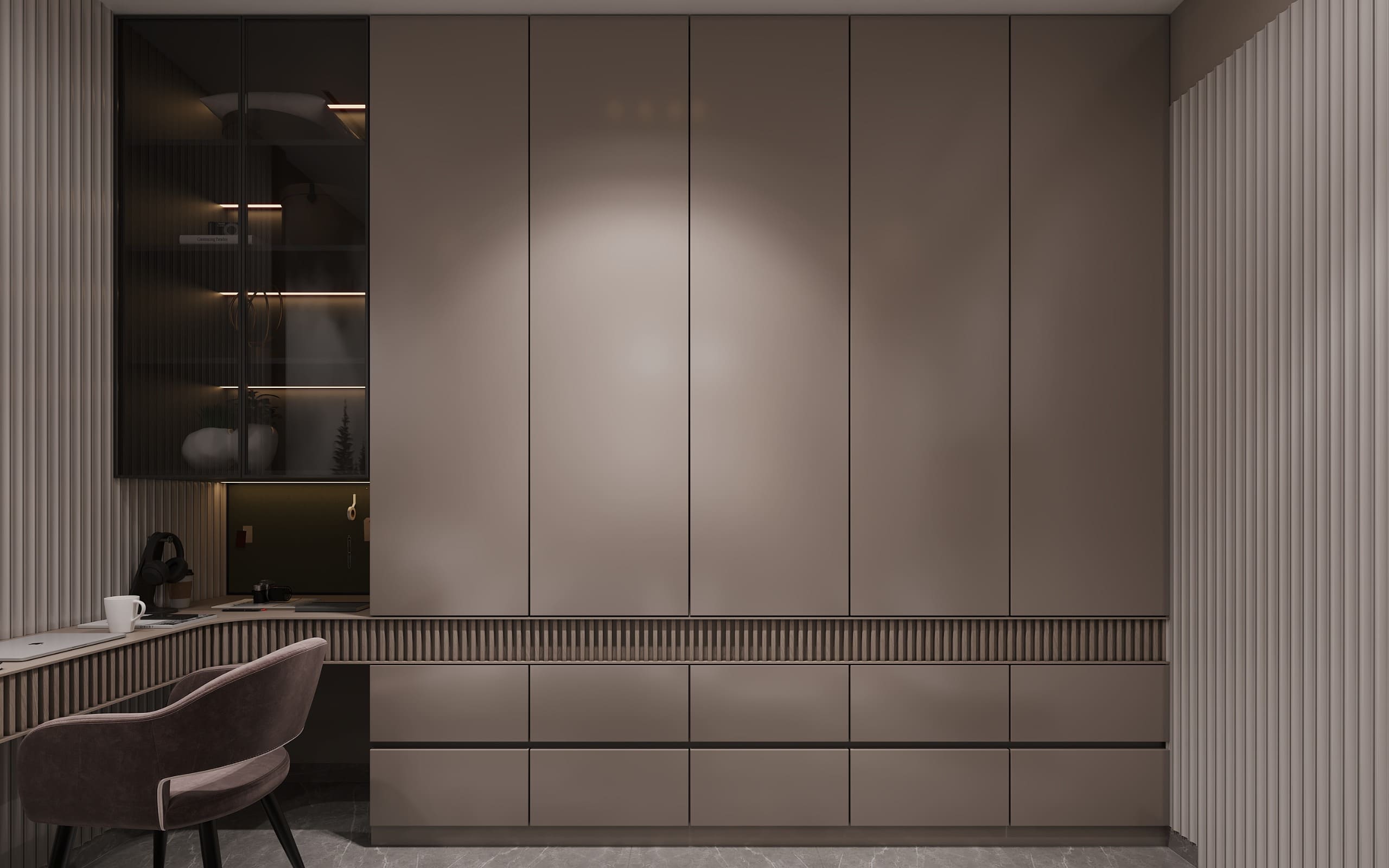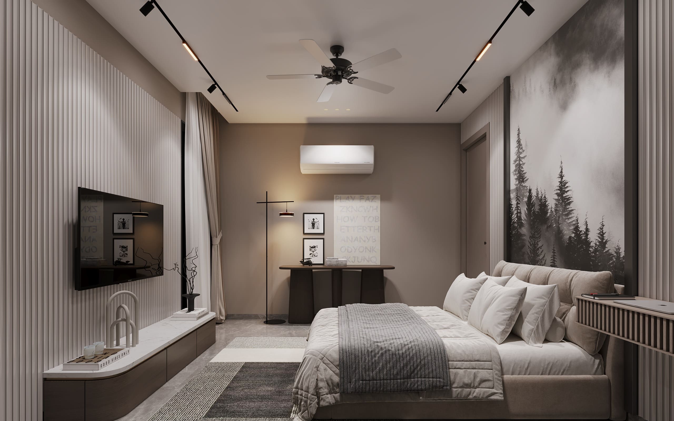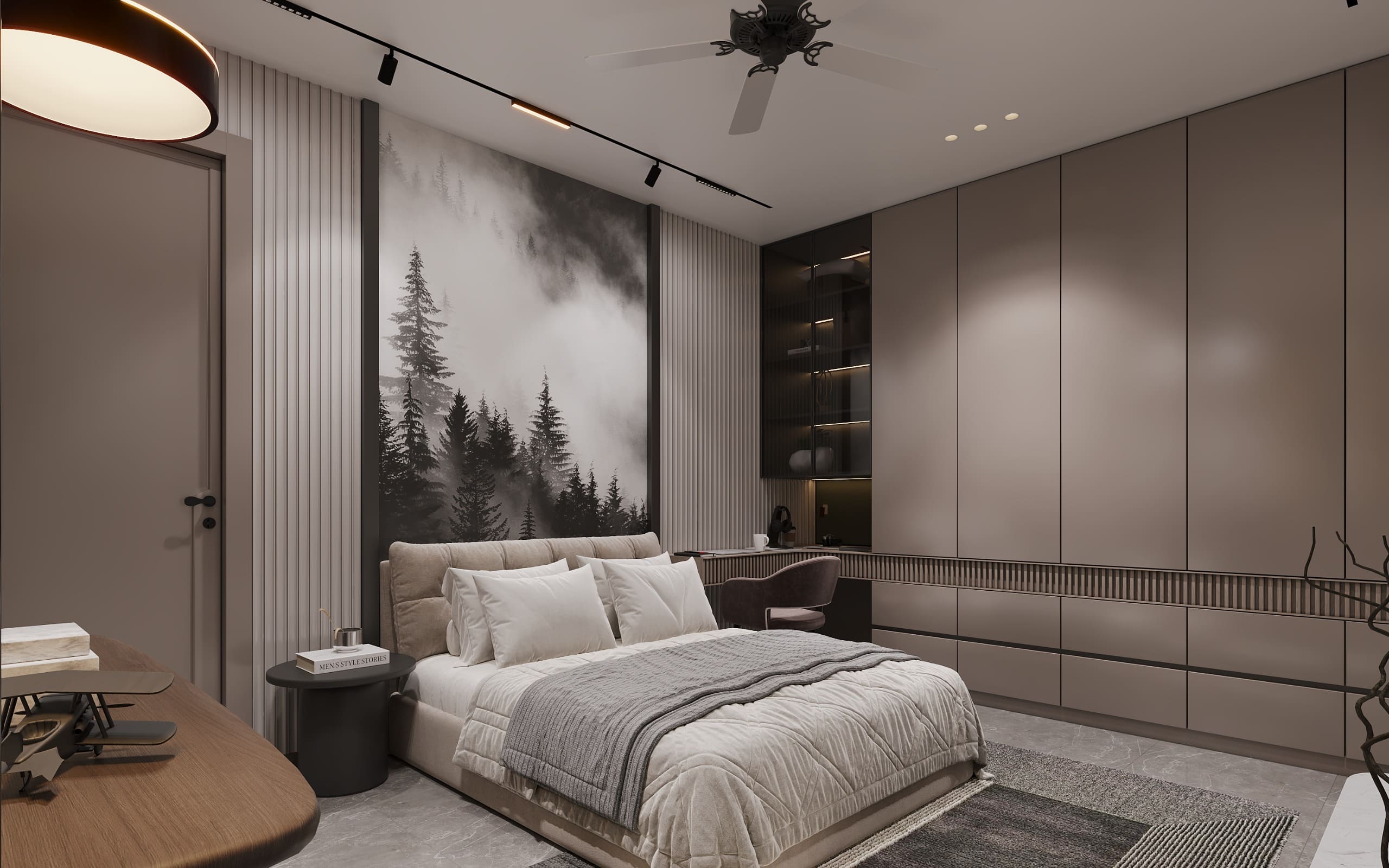 At the heart of the space lies a plush, inviting bed framed by a captivating mural of misty pine trees—an artistic nod to nature that adds depth and emotion to the room. Thoughtfully placed lighting highlights the clean architectural lines and enhances the subtle textures of fabric, wood, and stone. The built-in cabinetry and sleek work desk integrate functionality with elegance, making the room both practical and effortlessly stylish.